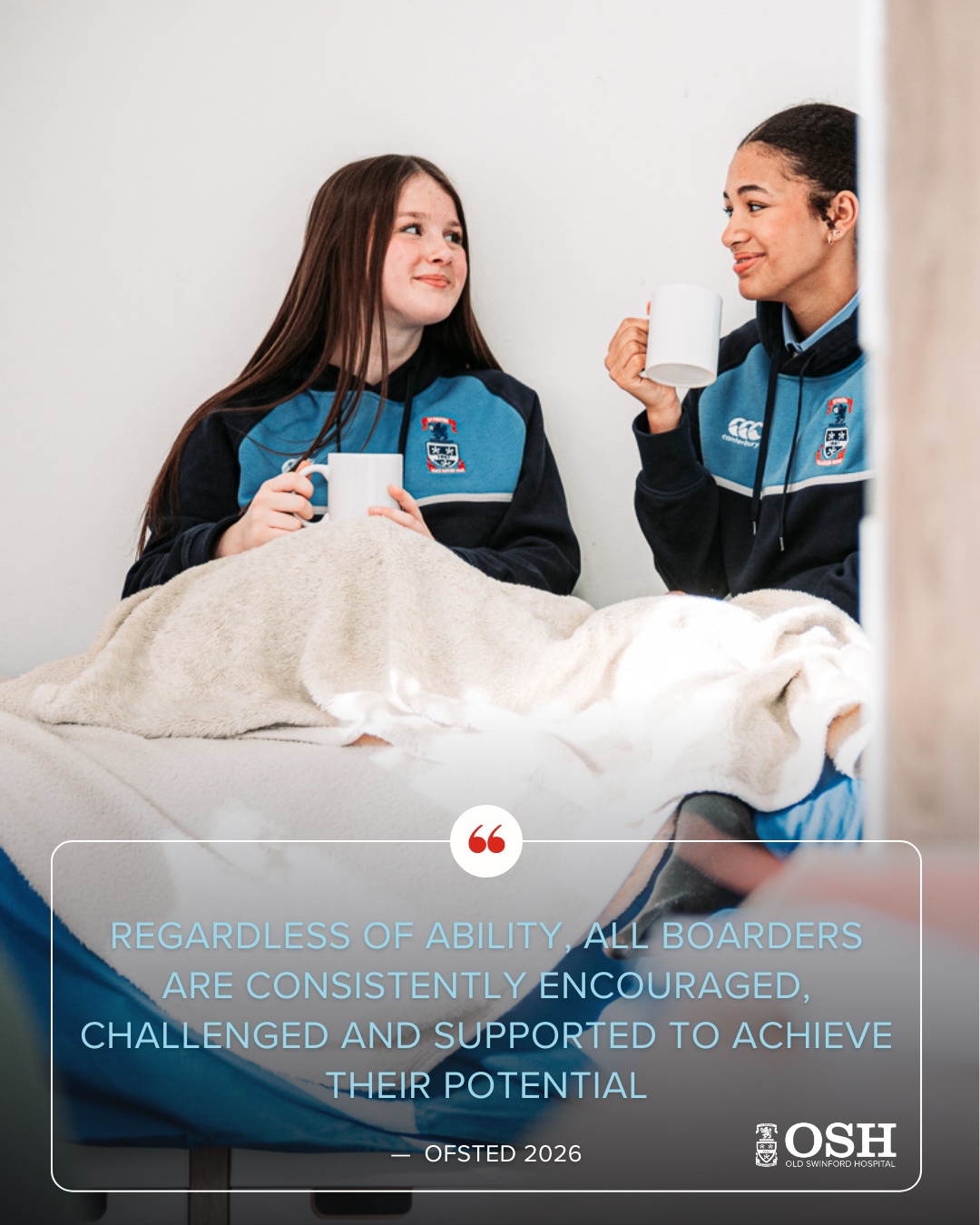 Two girls in OSH hoodies sitting on a bed, their legs covered by a blanket, drinking tea and chatting